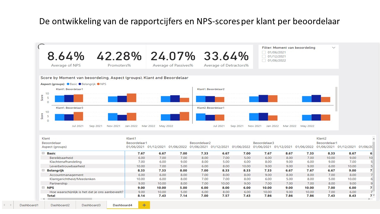 De crux: Elke 6 maanden je overall prestatie meten, via rapportcijfers, bij de klant op 6 hoofd thema’s en de NPS-score. Vervolgens de cijfers bespreken met de klant: Wat moeten we doen om een 9 te halen? Deze gesprekken moeten leiden tot voorstellen en acties met de klant die hogere rapportcijfers en een hogere NPS-score opleveren.