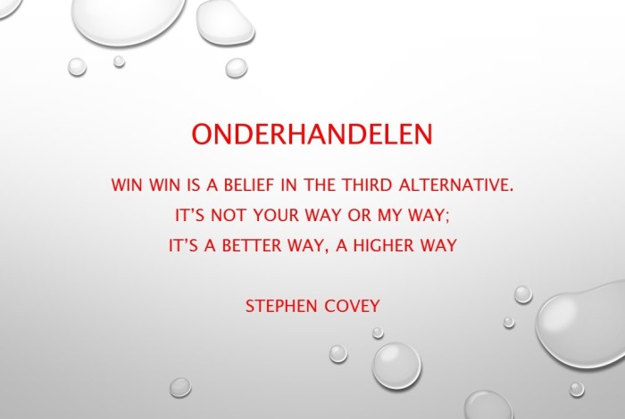 Denk dus goed na voordat je gaat onderhandelen wat je wil bereiken en het proces. Ga vooraf aan het hele proces met je klant praten over de te bereiken resultaten en het proces.